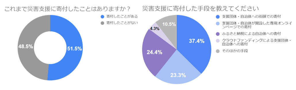 1) 災害支援寄付経験者が51.5%と半数以上。約4人に1人はふるさと納税による自治体への寄付を通じて災害支援。
