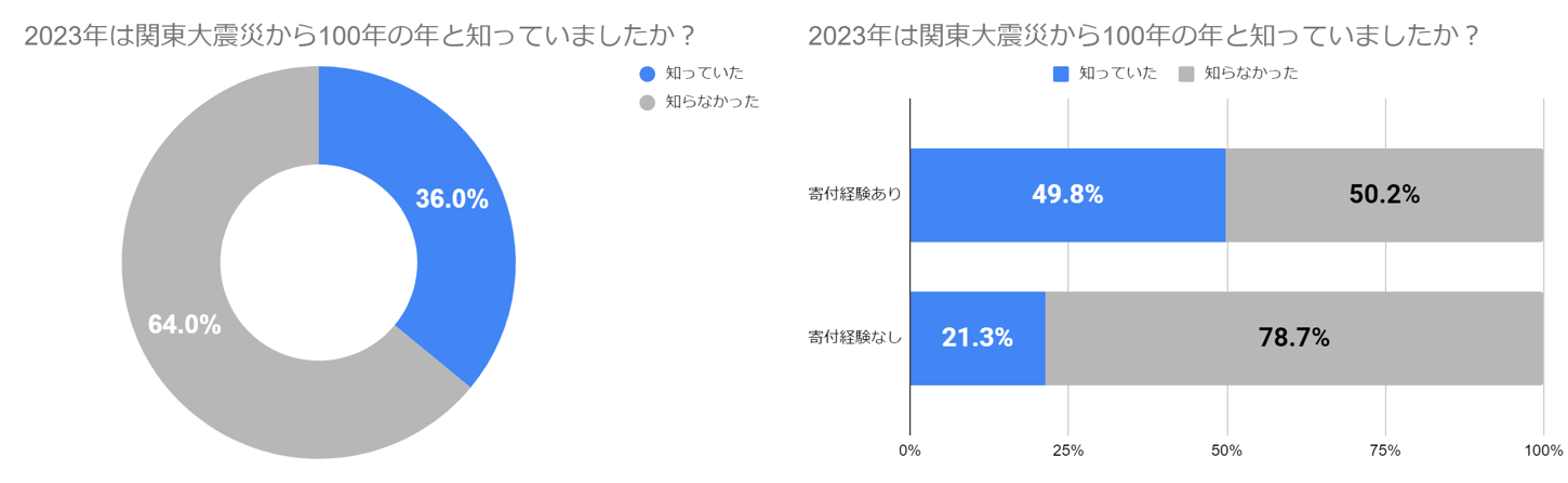 ◆ 今年が関東大震災から100年と知っていた人は36%。災害支援の寄付経験者に限定すると約半数が認識しており、災害への意識の高さがうかがえる。