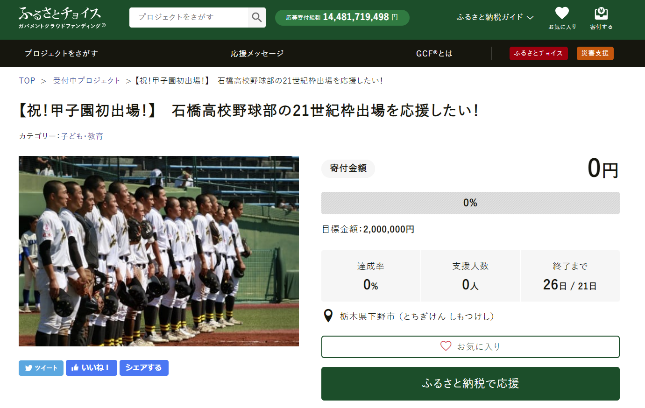 ◆ プロジェクト名: 【祝!甲子園初出場!】石橋高校野球部の21世紀枠出場を応援したい!