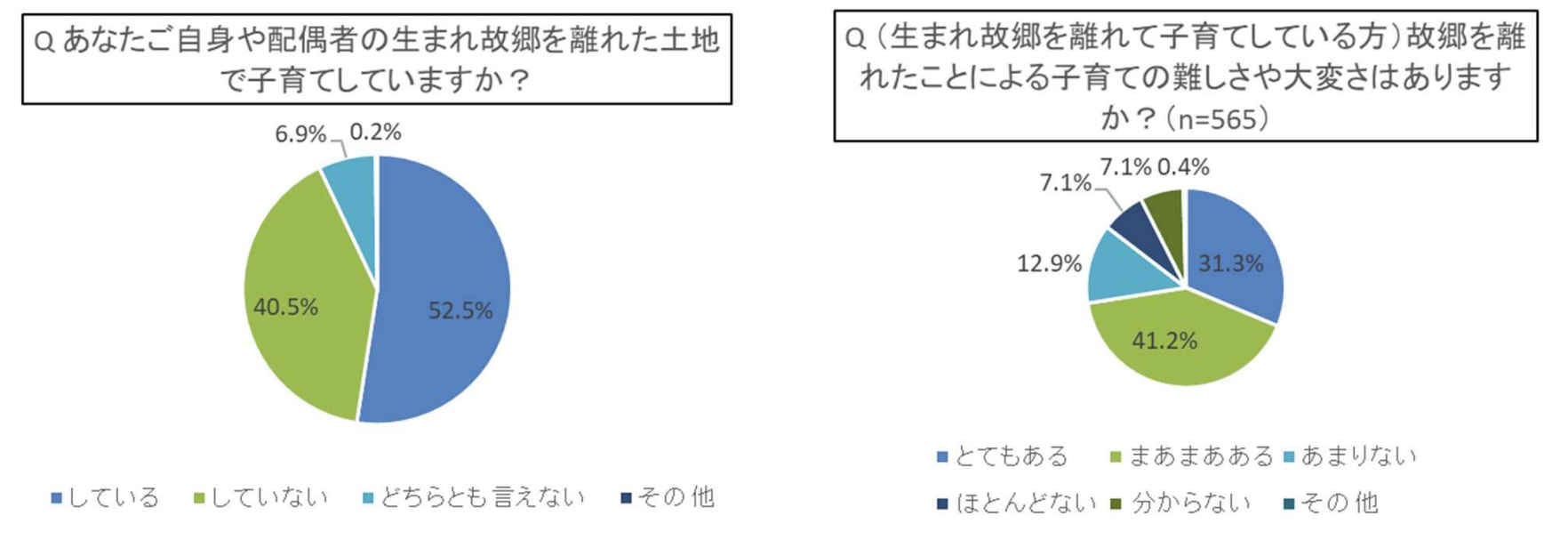 ◆ 故郷を離れて子育てしているのは52.5%で、そのうち72.5%が子育てについて難しさ・大変さを感じていることが判明。