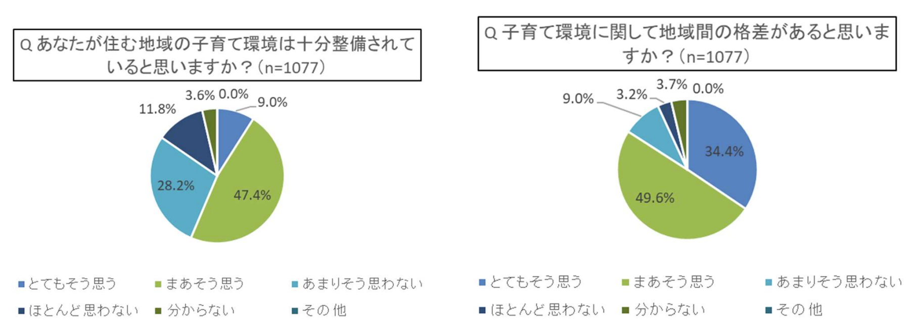 ◆ 居住地域の子育て環境が整備されているかを尋ねると、整備されている(「とてもそう思う」「まあそう思う」)と回答したのは56.4%。一方、行政の子育て支援策を含む「子育て環境」に関して地域間格差がある(「とてもそう思う」「まあそう思う」)と答えたのは84%。
