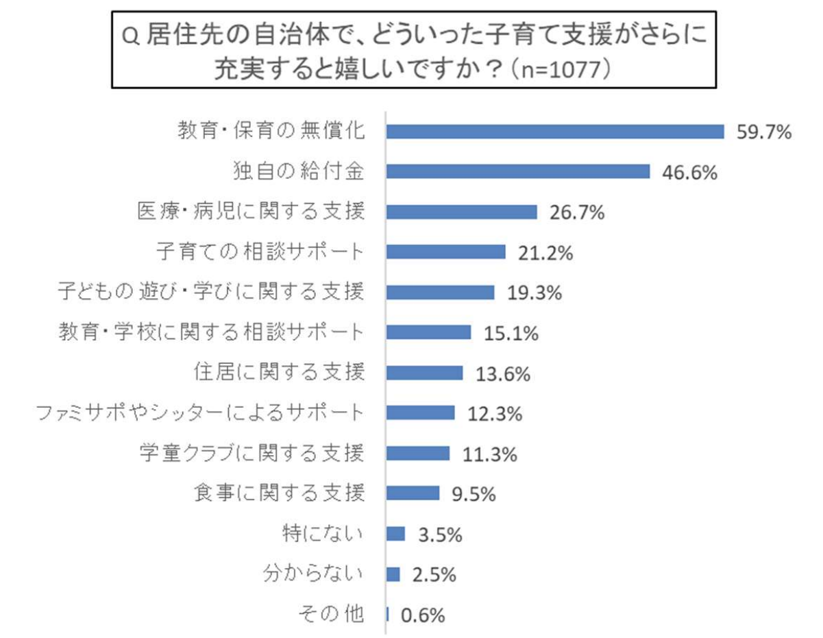 ◆ 居住先の自治体に対してさらなる充実を要望したい施策は、回答数が多かった順に「教育・保育の無償化」(59.7%)、「独自の給付金」(46.6%)、「医療・病児に関する支援」(26.7%)。