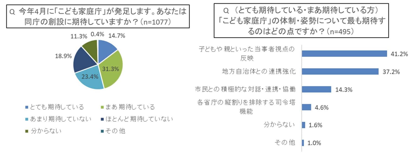 ◆ 2023年4月発足の「こども家庭庁」に期待している人は46%。最も期待することは「子どもや親といった当事者視点の反映」(41.2%)、「地方自治体との連携強化」(37.2%)。