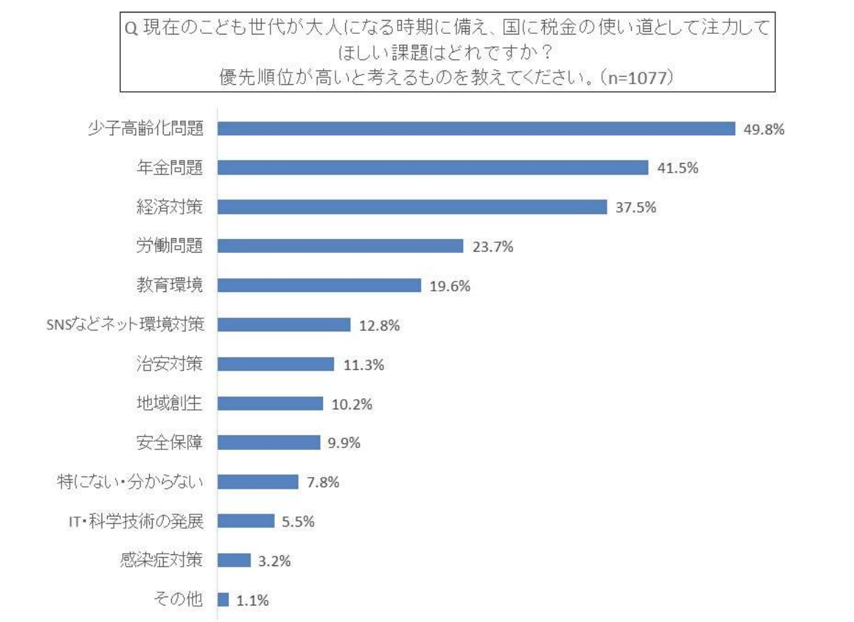 ◆ 子どもの将来を見据え、国に税金の使い道として注力してほしい課題は「少子高齢化問題」(49.8%)、「年金問題」(41.5%)、「経済対策」(37.5%)の順に回答が多かった。