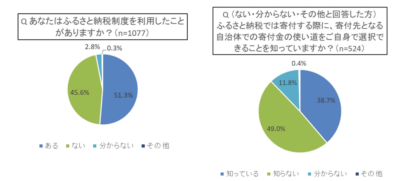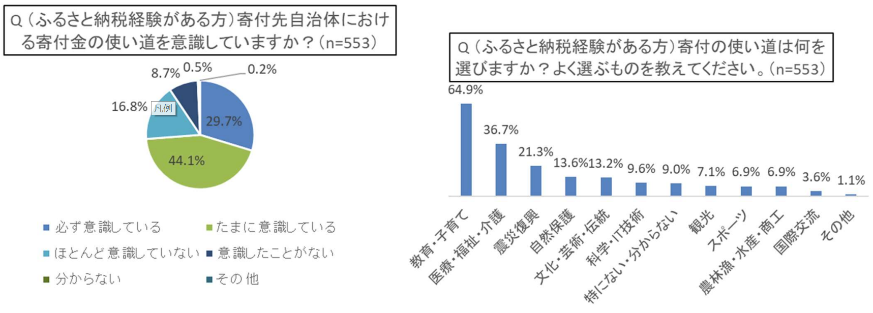 ◆ ふるさと納税を利用したことがあるのは51.3%。そのうち約73%は寄付時に「寄付金の使い道」を意識していると答え、選ぶ使い道として多い順に「教育・子育て」(64.9%)、「医療・福祉・介護」(36.7%)、震災復興(21.3%)となった。