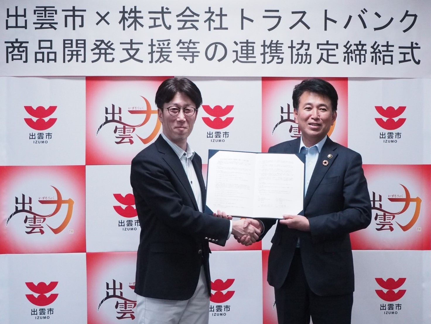 島根県出雲市(市長:飯塚 俊之)と国内最大級のふるさと納税総合サイト「ふるさとチョイス」を企画・運営する株式会社トラストバンク(本社:東京都渋谷区、代表取締役:川村憲一、以下「トラストバンク」)は、本日5月18日に商品開発支援等の連携に関する協定を締結いたしました。本協定により、地域の事業者の自立した持続可能な事業運営を推進するため、地場産品を活用した商品開発支援及び販路の提供に協力して取り組みます。