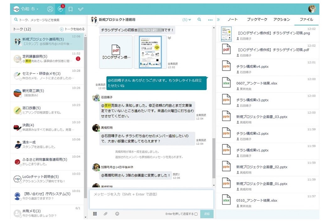 LoGoチャットは、LGWANとインターネットで使える自治体向けビジネスチャットツールです。自治体職員はパソコンやスマートフォンで庁内や他自治体、外部事業者とメッセージやファイル・画像の送受信ができます。電話、メール、FAX、対面主義といった行政のコミュニケーションをビジネスチャットに置き換えることで、生産性向上や情報共有・意思決定の迅速化、ペーパーレスなどにつながります。さらに、LoGoチャットには全国約30,000名の職員が参加する「災害対応」「コロナ対応」「行政DX」「ChatGPT」などテーマごとにトークルーム内で意見交換できるLoGoチャットユーザーグループがあり、自治体が知りたい業務知見やノウハウを共有できるプラットフォームになっています。