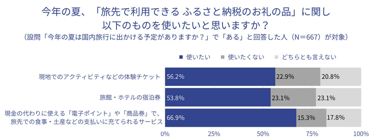 今年の夏に国内旅行がある人は、ふるさと納税経験者全体の6割強。旅先で利用できるふるさと納税のお礼の品に関し、旅先での食事・土産などの支払いで使える電子ポイントや商品券をもらい、現地で使いたいと考える人は66.9%。