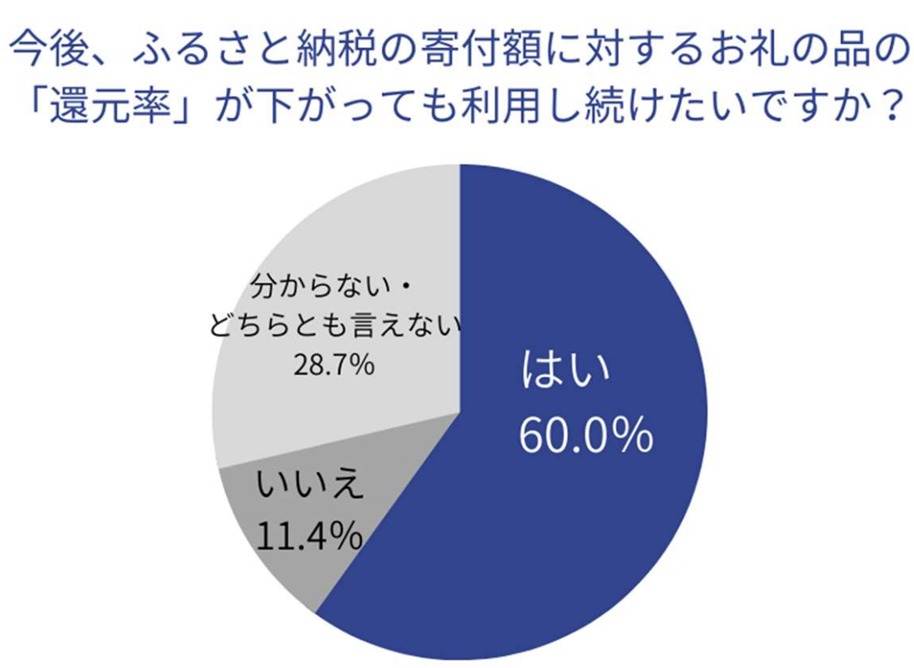 ふるさと納税のルール改正に当たって、10月以降、お礼の品をもらうための寄付額が値上げされたり、同じ寄付額でも内容量が減ったり質が下がったりする可能性がある中で、お礼の品の「還元率」が下がっても利用し続けたいかを尋ねた質問に「はい」と答えたのは全体の60.0%。「いいえ」「分からない・どちらとも言えない」は合わせて40.1%となった。