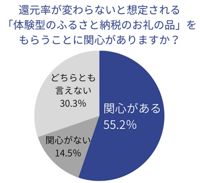 一方、経費として計上される送料がかからないためルール改正の影響を受けづらいと想定される「体験型のふるさと納税のお礼の品」に関心があるかを尋ねると、関心があると答えたのは55.2%。
