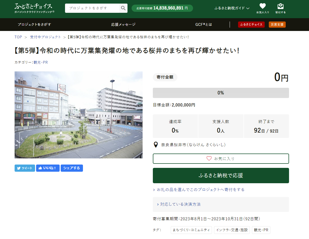 奈良県桜井市(市長:松井正剛)と、国内最大級のふるさと納税総合サイト「ふるさとチョイス」( https://www.furusato-tax.jp/ )を企画・運営する株式会社トラストバンク(本社:東京都渋谷区、代表取締役:川村憲一、以下「トラストバンク」)は、本日8月1日より、トラストバンクが提供する、ふるさと納税制度を通じてクラウドファンディング型で寄付を募る仕組み「ガバメントクラウドファンディング®」(以下「GCF®」)で、桜井駅前の活性化を目的としたプロジェクトを開始します。募集期間は2023年8月1日~10月31日、目標寄付金額は200万円です。