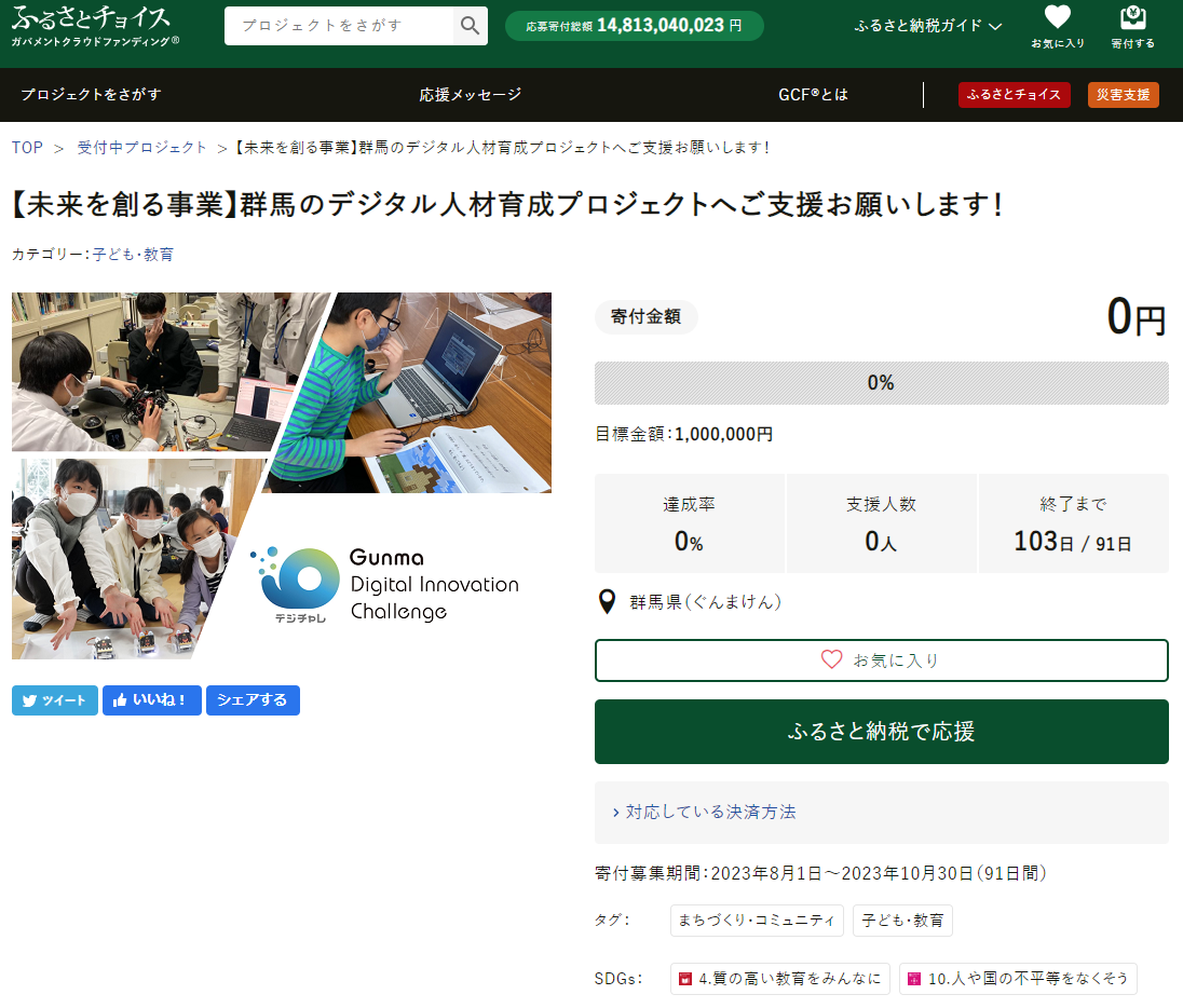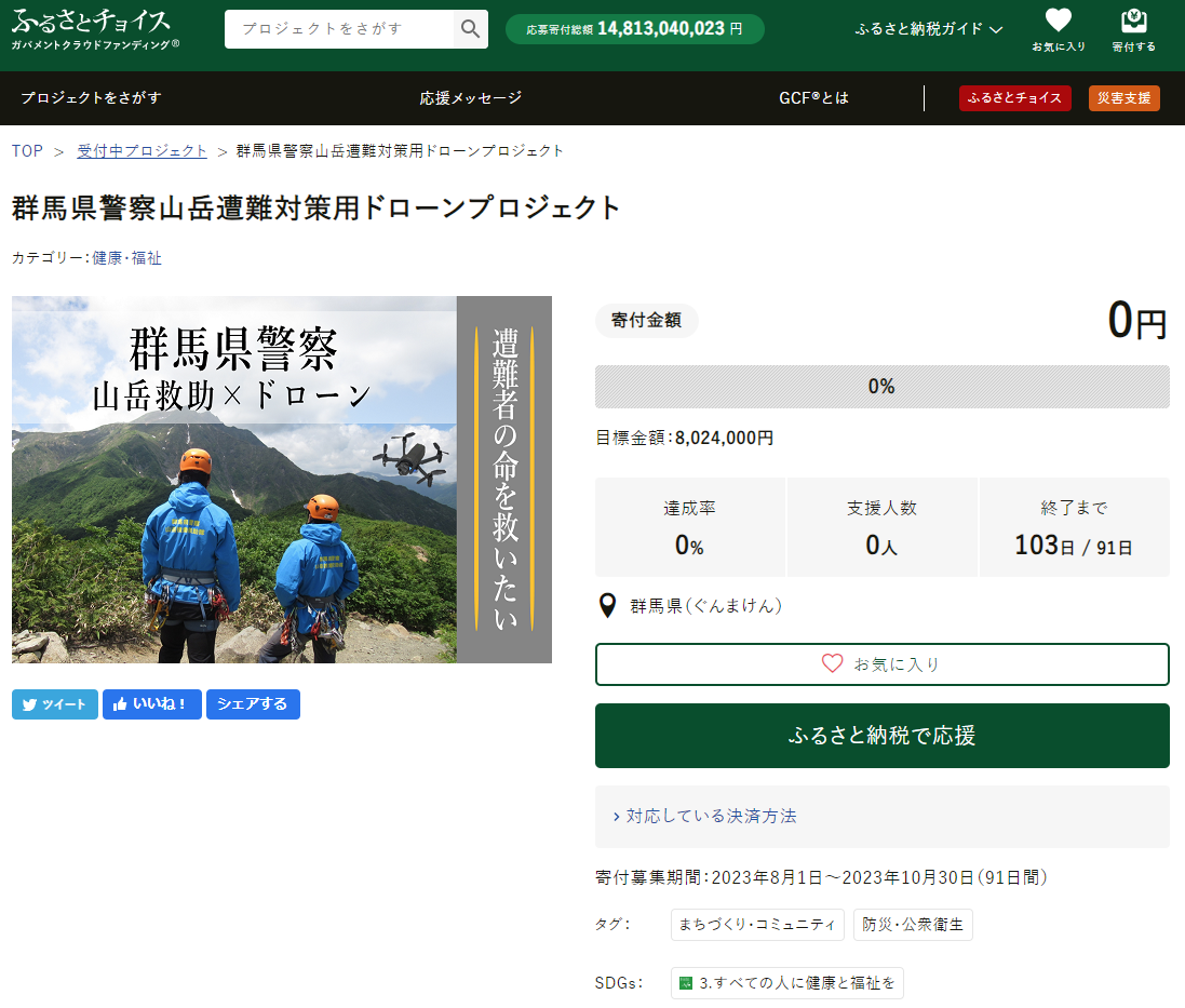 群馬県(知事:山本一太)と国内最大級のふるさと納税総合サイト「ふるさとチョイス」( https://www.furusato-tax.jp/ )を企画・運営する、株式会社トラストバンク(本社:東京都渋谷区、代表取締役:川村憲一、以下「トラストバンク」)は、本日8月1日トラストバンクが提供する、ふるさと納税制度を通じてクラウドファンディング型で寄付を募る仕組み「ガバメントクラウドファンディング®」(以下「GCF®」)で、子どもたちのデジタルスキル向上のための「群馬のデジタル人材育成プロジェクト」と、山岳遭難対策用ドローンの購入目的とした「山岳遭難対策用ドローンプロジェクト」を立ち上げました。募集期間は2023年8月1日~2023年10月30日で、目標金額は、「群馬のデジタル人材育成プロジェクト」は1,000,000円、「山岳遭難対策用ドローンプロジェクト」は8,024,000円です。