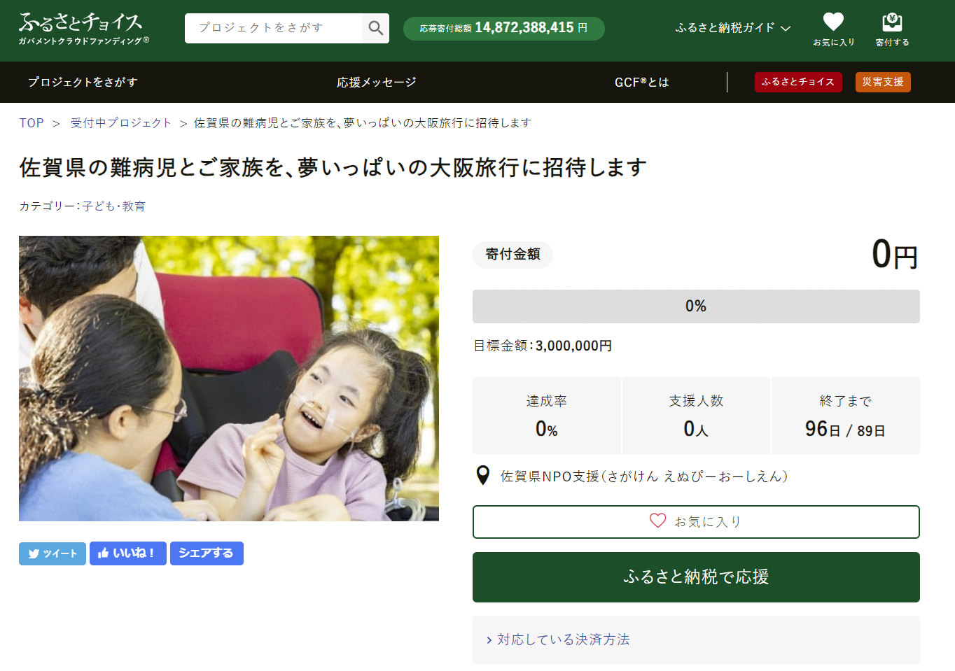 国内最大級のふるさと納税総合サイト「ふるさとチョイス」( https://www.furusato-tax.jp/ )を企画・運営する、株式会社トラストバンク(本社:東京都渋谷区、代表取締役:川村憲一、以下「トラストバンク」)は、本日8月14日、トラストバンクが提供する、ふるさと納税制度を通じてクラウドファンディング型で寄付を募る仕組み「ガバメントクラウドファンディング®」(以下「GCF®」)で、佐賀県の難病児とその家族を大阪旅行に招待するための資金調達プロジェクトを開始しました。