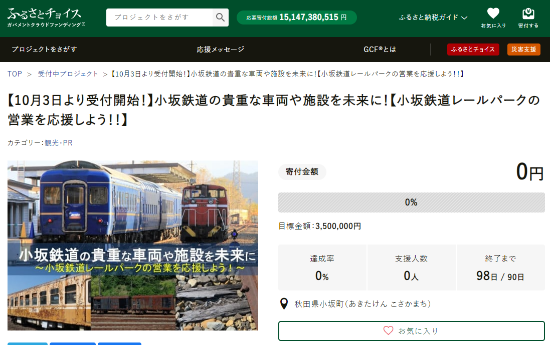 秋田県小坂町(町長:細越満、以下「小坂町」)と国内最大級のふるさと納税総合サイト「ふるさとチョイス」( https://www.furusato-tax.jp/ )を企画・運営する、株式会社トラストバンク(本社:東京都渋谷区、代表取締役:川村憲一、以下「トラストバンク」)は、10月3日正午よりトラストバンクが提供する、ふるさと納税制度を通じてクラウドファンディング型で寄付を募る仕組み「ガバメントクラウドファンディング®」(以下「GCF®」)で、小坂鉄道レールパークの貴重な車両や施設の保全維持を目的としたプロジェクトを開始します。募集期間は10月3日~12月31日で、目標寄付金額は350万円です。