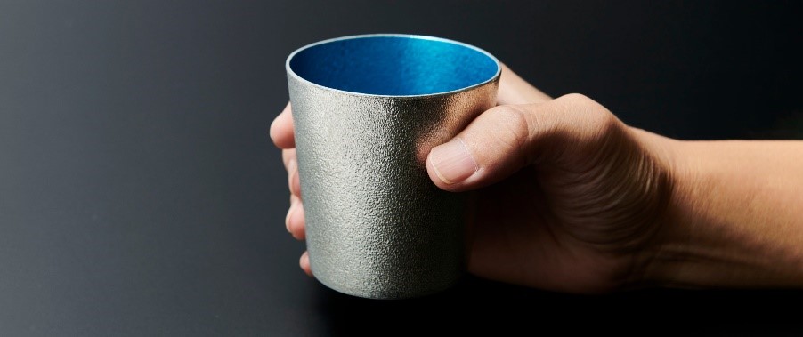 内側を覗き込むと、鮮烈でありながら奥行きも感じさせる一面のブルー。そんな、透明感のある水面のような輝きが印象的な、錫(すず)100%のタンブラー。