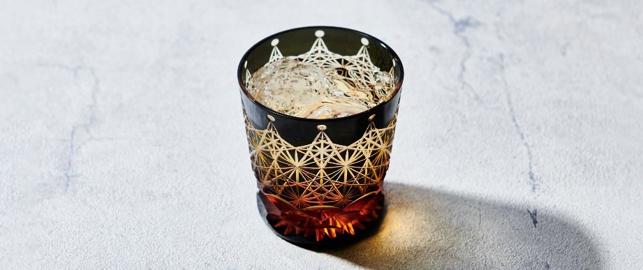 今回の切子グラスで目を引くのは、口元に入った王冠のモチーフ。伝統的な柄の一つである「菊繋ぎ紋」をベースにアレンジを加えたカットで、「和」のようでもあり「洋」のようでもある小粋なデザインです。太めの幅でカットすることで生まれるギラギラとした力強さと、威厳や風格を備えた存在感を、ぜひ味わってほしいグラスです。