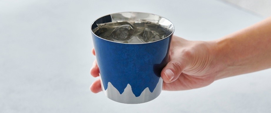タンブラーのベースは新潟県燕市で加工されたステンレス二重構造のカップ。中空層のあるダブルウォールなので保温・保冷性に優れ、温かいお湯割りも冷たいロックも冷めにくく・温まりにくい性質があります。タンブラーの縁が口当たりの良い絶妙な角度に設計されているのも、細やかな心遣いを感じるポイント。めでたく、優美な富士山のカップをテーブルスタイリングに加えて、毎日を少し贅沢に彩ってみてはいかがでしょうか。