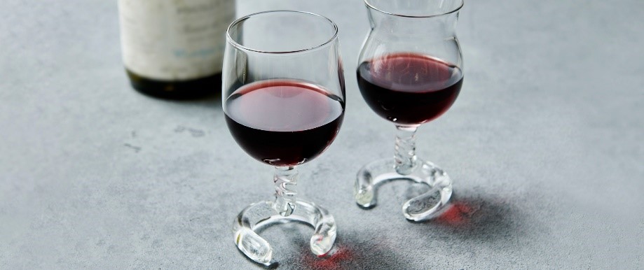 グラスの形状は、ベーシックな「ワイングラス型」と、開いた口縁で香りを感じやすい「チューリップ型」の2タイプ。ステムはねじれを入れた遊び心のあるフォルムで、ボトムのプレートは幸運や厄払いを象徴するラッキーシンボルの馬蹄形。機能面でもデザイン面でもスキが見当たらない、オールマイティな耐熱グラスです。