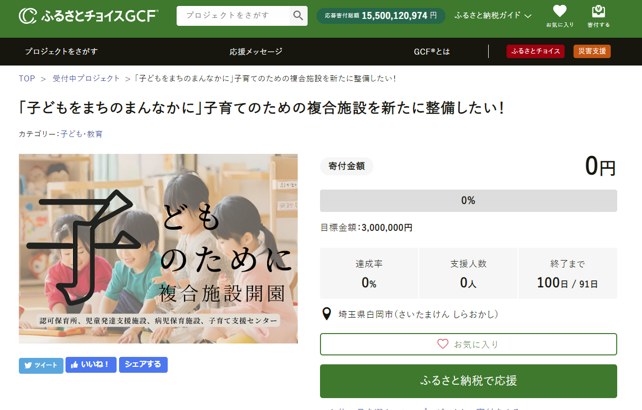 埼玉県白岡市(市長:藤井 栄一郎、以下「白岡市」)と国内最大級のふるさと納税総合サイト「ふるさとチョイス」( https://www.furusato-tax.jp/ )を企画・運営する、株式会社トラストバンク(本社:東京都渋谷区、代表取締役:川村憲一、以下「トラストバンク」)は、本日11月2日トラストバンクが提供する、ふるさと納税制度を通じてクラウドファンディング型で寄付を募る仕組み「ガバメントクラウドファンディング®」(以下「GCF®」)で、子育てのための複合施設整備への支援を目的としたプロジェクトを開始します。募集期間は2023年11月2日~2024年1月31日で、目標寄付金額は300万円です。