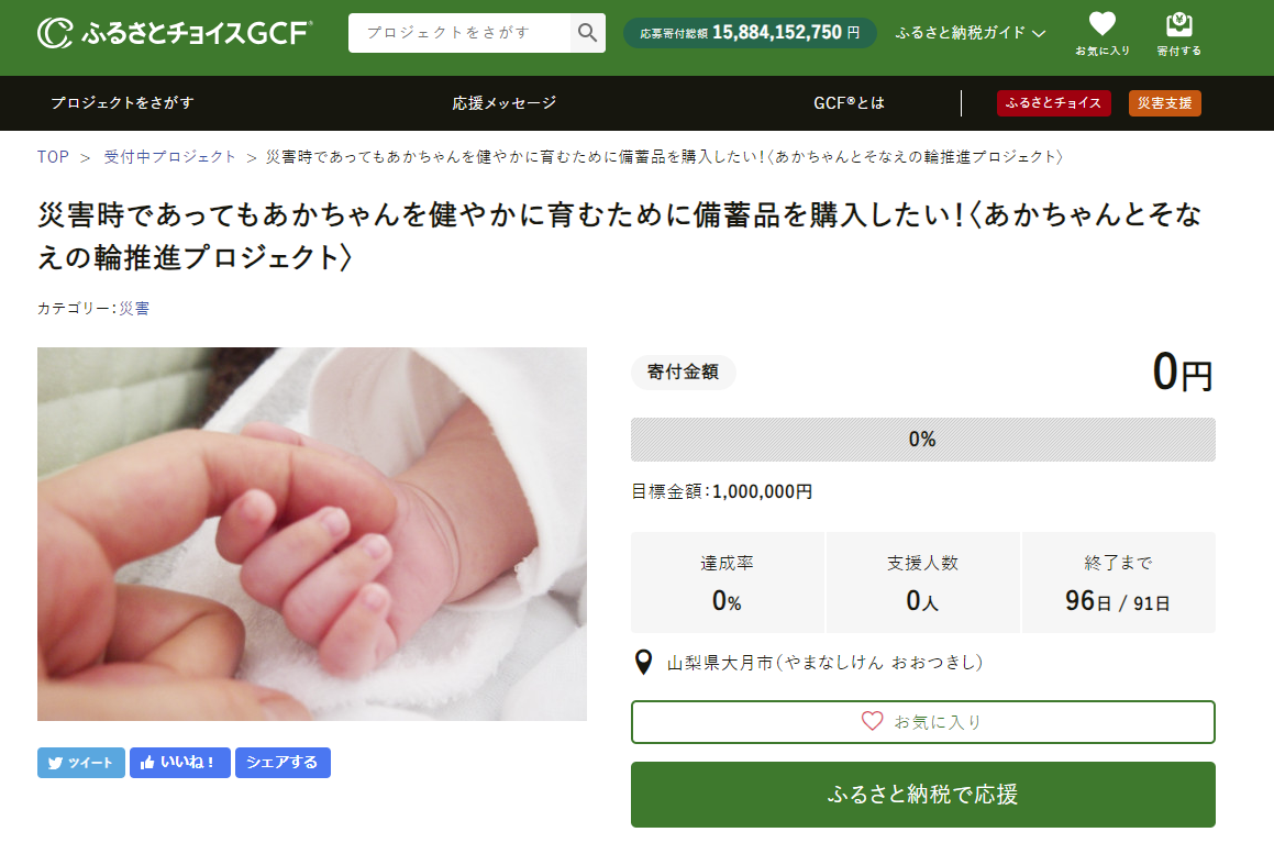 山梨県大月市(市長:小林 信保、以下「大月市」)と国内最大級のふるさと納税総合サイト「ふるさとチョイス」( https://www.furusato-tax.jp/ )を企画・運営する、株式会社トラストバンク(本社:東京都渋谷区、代表取締役:川村憲一、以下「トラストバンク」)は、本日12月1日トラストバンクが提供する、ふるさと納税制度を通じてクラウドファンディング型で寄付を募る仕組み「ガバメントクラウドファンディング®」(以下「GCF®」)で、赤ちゃんのための防災整備を目的としたプロジェクトを開始します。募集期間は2023年12月1日~2024年2月29日で、目標寄付金額は100万円です。