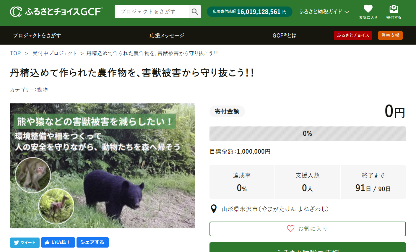 山形県米沢市(市長:中川勝、以下「米沢市」)と国内最大級のふるさと納税総合サイト「ふるさとチョイス」( https://www.furusato-tax.jp/ )を企画・運営する、株式会社トラストバンク(本社:東京都渋谷区、代表取締役:川村憲一、以下「トラストバンク」)は、本日12月5日トラストバンクが提供する、ふるさと納税制度を通じてクラウドファンディング型で寄付を募る仕組み「ガバメントクラウドファンディング®」(以下「GCF®」)で、クマを含めた鳥獣被害対策を目的としたプロジェクトを開始します。募集期間は2023年12月5日~2024年3月3日で、目標寄付金額は100万円です。