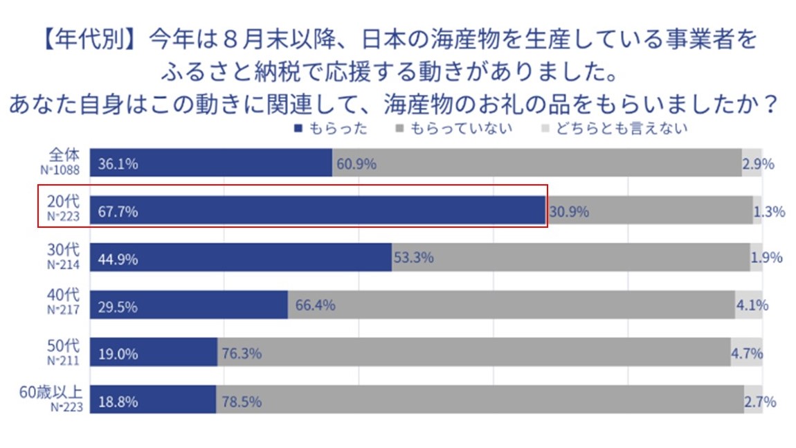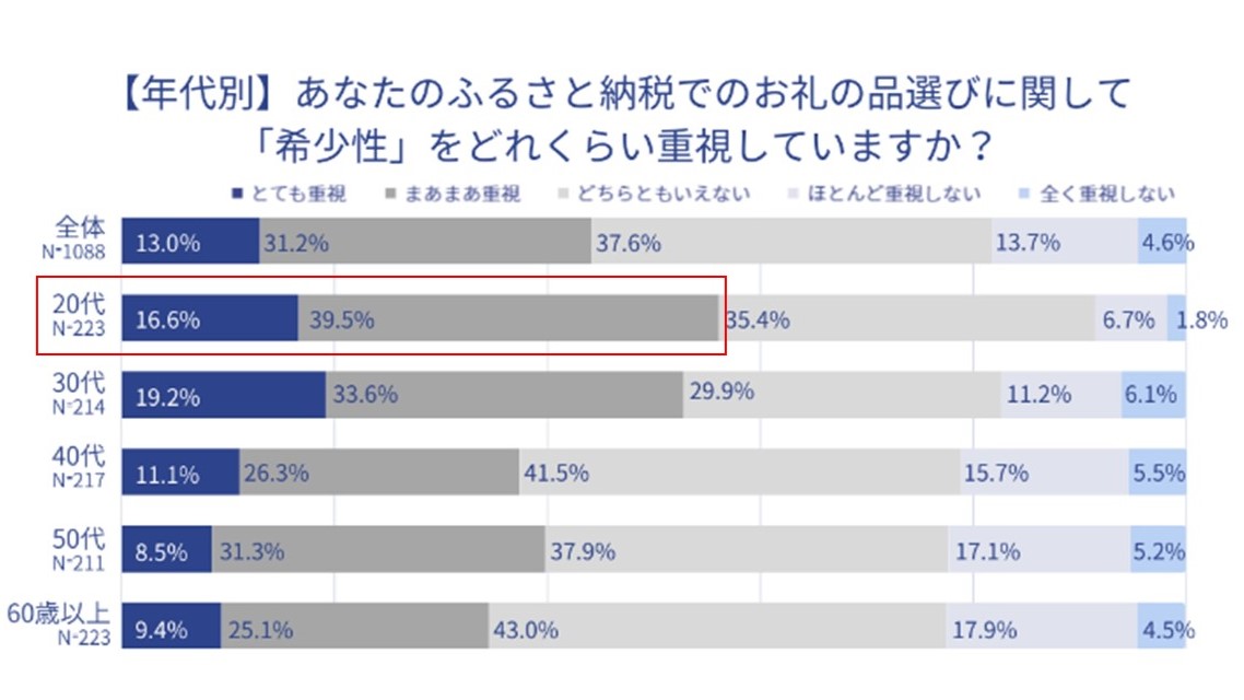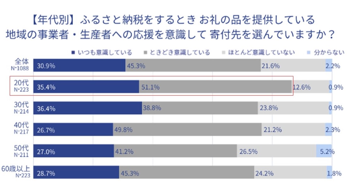 20 代の若い世代は、ふるさと納税を地域への応援手段として認知しており、寄付することで地域への貢献を感じていると考えられます。ふるさと納税でしか出会えない希少な特産品や、地場での体験に対して他の世代よりも関心が高いのも特徴であると同時に、社会情勢や経済状況などの影響が寄付行動に強く出る世代でもあります。今後の地域支援の流れをけん引する存在として、ますます存在感を増していくことが予想されます。また、「地域の若者×自治体」の共創型GCF®プロジェクトが多数登場し、若者のアイデアを基にした、ふるさと納税の活用が進んでいます。