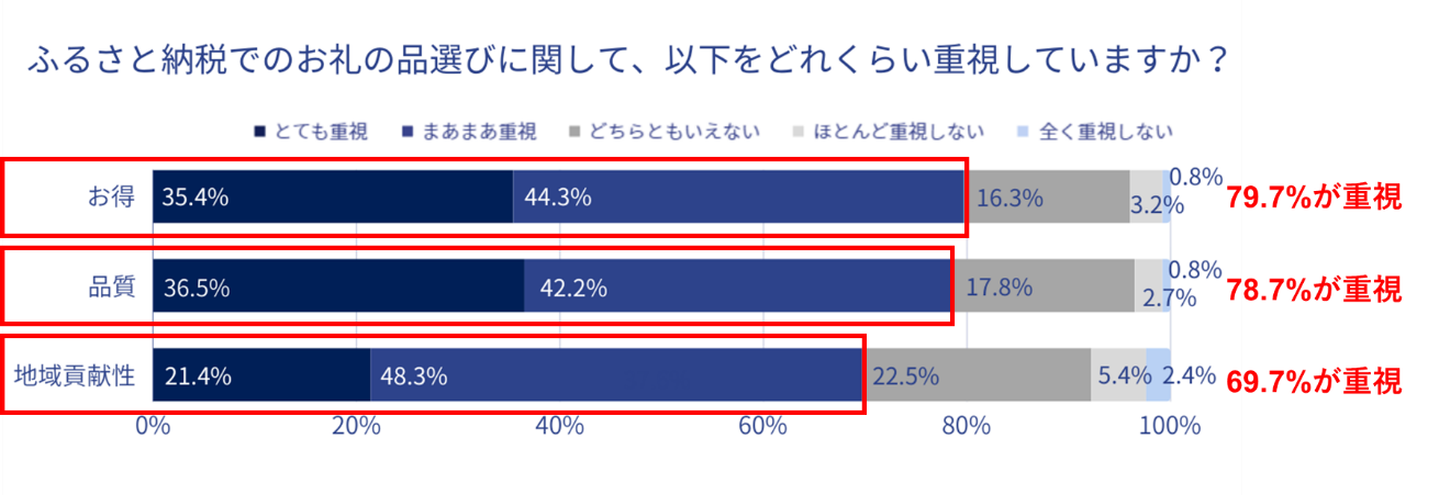 また、寄付者全体のお礼の品選びの傾向として、お得感だけでなく、品質が高いことや地域貢献性が高いことといった、+αの価値も重要視していることが分かりました。ふるさと納税を通じて「地域には高品質な特産品が多い」といった認識が広まりつつあり、SDGsなどの意識の高まりも相まって、家具など毎日長く使うものをお礼の品に選ぶ人も増えているのも最新のトレンドです。