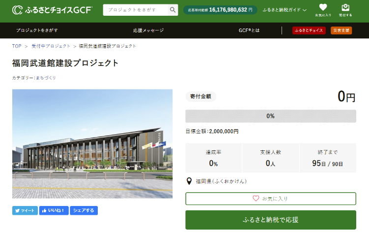 福岡県(知事:服部 誠太郎)と国内最大級のふるさと納税総合サイト「ふるさとチョイス」( https://www.furusato-tax.jp/ )を企画・運営する、株式会社トラストバンク(本社:東京都渋谷区、代表取締役:川村憲一、以下「トラストバンク」)は、12月15日、トラストバンクが提供する、ふるさと納税制度を通じてクラウドファンディング型で寄付を募る仕組み「ガバメントクラウドファンディング®」(以下「GCF®」)で、福岡武道館建設プロジェクトを開始します。募集期間は2023年12月15日~2024年3月13日で、目標寄付金額は200万円です。
