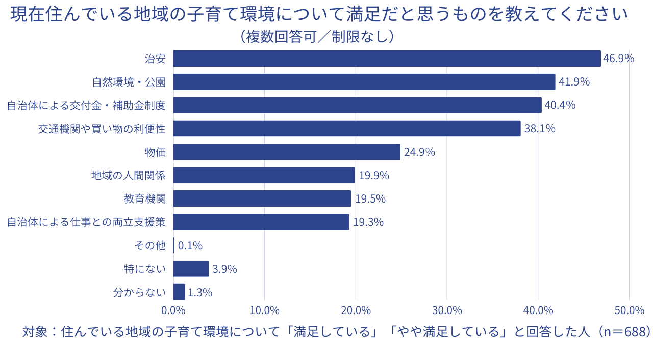◆ 現在住んでいる地域の子育て環境に満足しているのは64.7%。 満足しているポイントは多い順に「治安」「自然環境・公園」「自治体による交付金・補助金制度」。