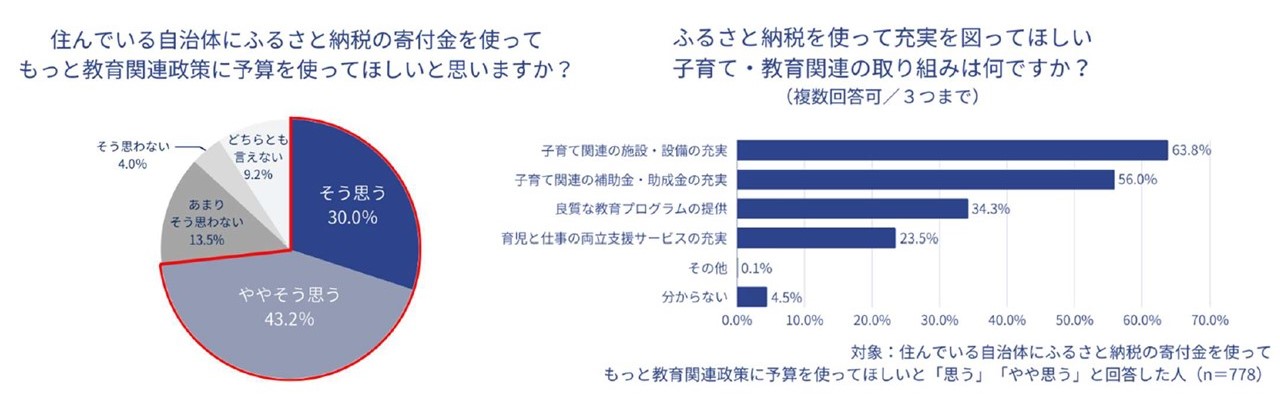 ◆ 53.9%の家庭がふるさと納税制度を利用。一方、 自分が住んでいる地域が集めたふるさと納税の寄付金が、どのように行政施策に活用されているのかを知らない人は60.8%。また、住んでいる自治体に対して「ふるさと納税の寄付金を使ってもっと教育関連政策に予算を投じてほしい」と考える人は73.2%に上った。 具体的には「子育て関連の施設・設備の充実」に使ってほしいと考える人がここでも最多だった。