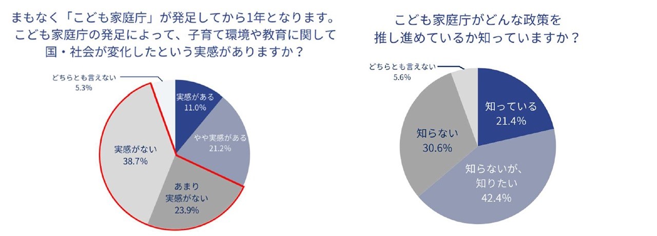 62.6%がこども家庭庁発足後の国や社会に「変化した実感はない」とした一方、同庁への関心は一定程度あり、42.4%は同庁がどんな政策を推し進めているか「知らないが、知りたい」と回答。