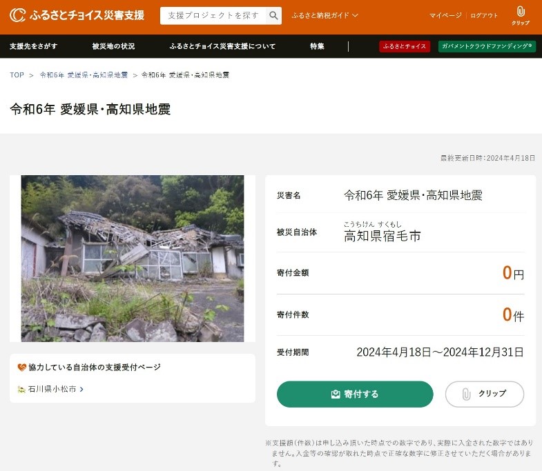 国内最大級のふるさと納税総合サイト「ふるさとチョイス」を企画・運営する株式会社トラストバンク(本社:東京都品川区、代表取締役:川村憲一、以下「トラストバンク」)は4月18日、ふるさと納税で被災自治体の災害支援に寄付できる仕組み「ふるさとチョイス災害支援」( https://www.furusato-tax.jp/saigai/ )で愛媛県と高知県で発生した最大震度6弱の地震によって被害を受けた高知県宿毛市の「災害時緊急寄付申込みフォーム」を開設しました。ふるさとチョイス災害支援は、自治体からのお礼の品がなく、寄付金は被災地の復旧・復興に使われます。