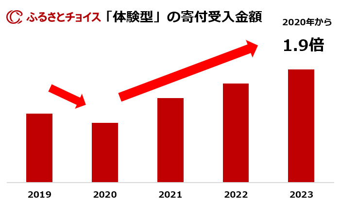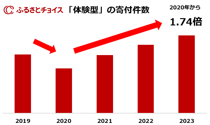 ふるさと納税のお礼の品というと、肉やフルーツなど「モノ」をもらうというイメージが強くありましたが、近年では、宿泊体験や移住体験、食の体験、アクティビティ体験、地域でのイベント参加体験など、「コト(体験)」をもらえる「体験型」のお礼の品への注目が高まっており、ふるさとチョイスでも約4万点以上が掲載されています(4月16日時点)。また、コロナ禍の影響を受け一時減少したものの、「体験型」のお礼の品への寄付は寄付件数、寄付金額ともに2021年以降、年々増加しており、各地域でも「体験型」のお礼の品のラインナップを拡充しています。