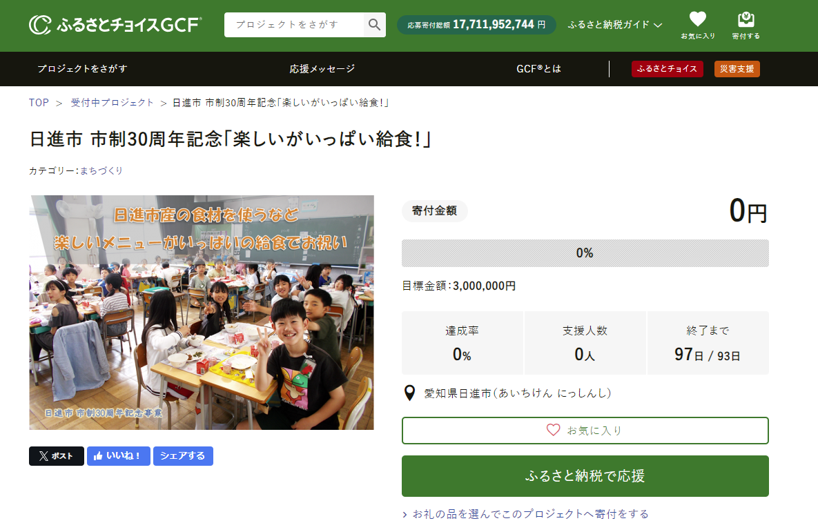 愛知県日進市(市長:近藤裕貴、以下「日進市」)と国内最大級のふるさと納税総合サイト「ふるさとチョイス」( https://www.furusato-tax.jp/ )を企画・運営する、株式会社トラストバンク(本社:東京都品川区、代表取締役:川村憲一、以下「トラストバンク」)は、5月31日トラストバンクが提供する、ふるさと納税制度を通じてクラウドファンディング型で寄付を募る仕組み「ガバメントクラウドファンディング®」(以下「GCF®」)で、日進市内の小中学校の学校給食における市制30周年記念メニュー提供費用を募るプロジェクトを開始します。募集期間は2024年5月31日~8月31日で、目標寄付金額は300万円です。
