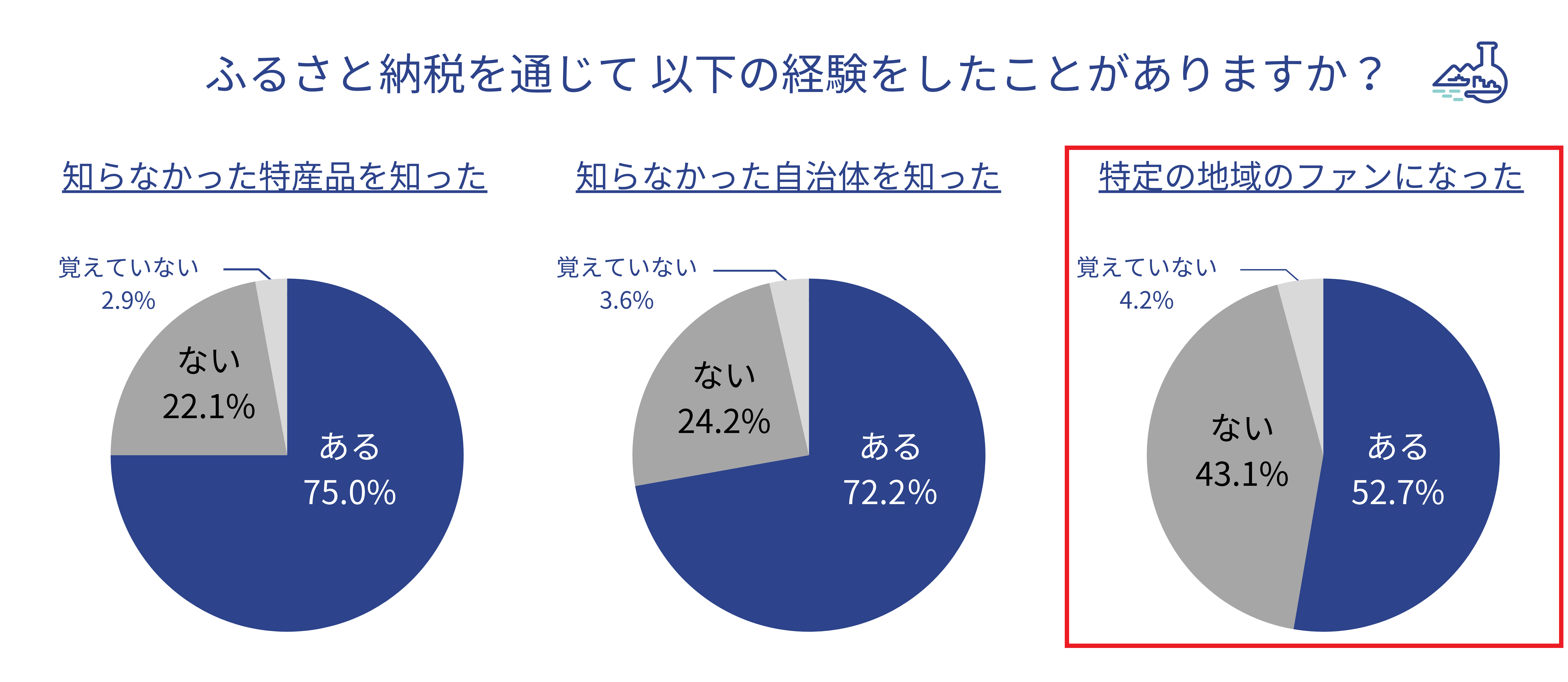 ・ ふるさと納税を通じて「知らなかった自治体を知る」「知らなかった特産品を知る」という経験がある人はいずれも7割超。また「寄付をきっかけに特定の地域のファンになる」という経験がある人は52.7%で、前回調査より11.8ポイント増えた。