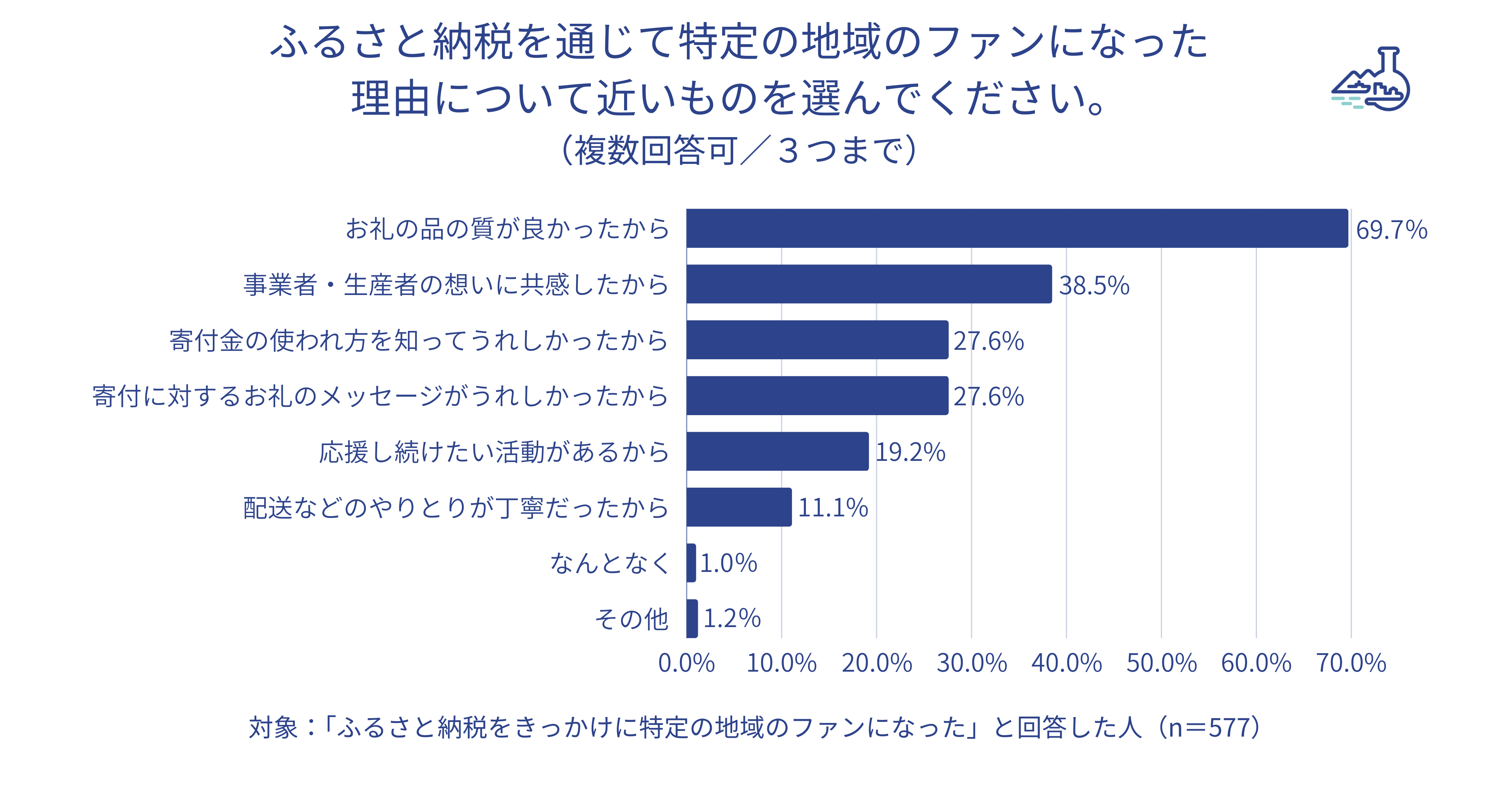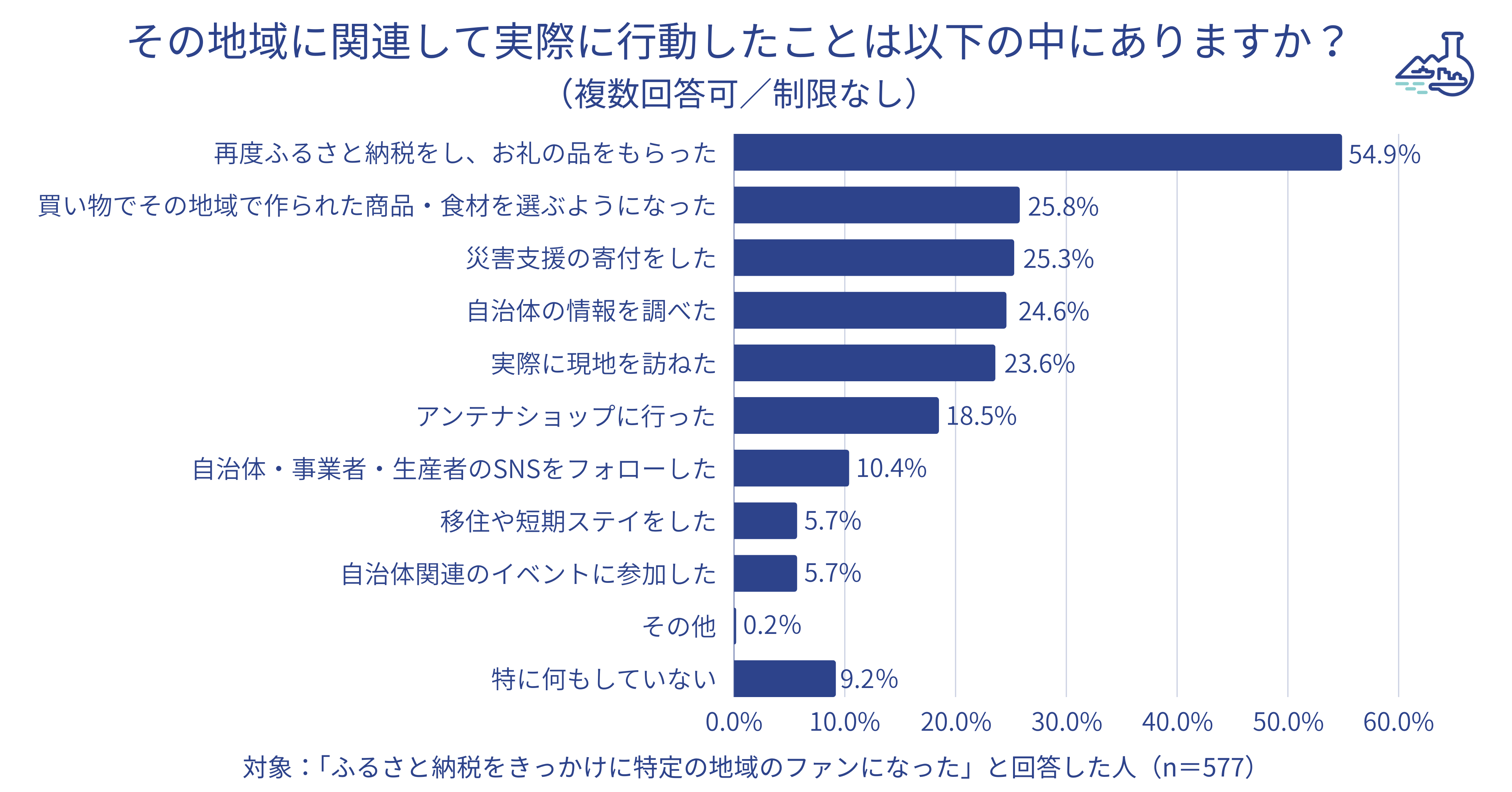 ・ 特定の地域のファンになったことがある人において、その理由として最多は「お礼の品の品質が良かった」(69.7%)。またファンになったことで実際に行動したことは「再度ふるさと納税し、お礼の品をもらった」が54.9%で最も多く、続いて「買い物でその地域の食品・食材を選んだ」「災害支援の寄付をした」(25.8%、25.3%)も回答を集めた。