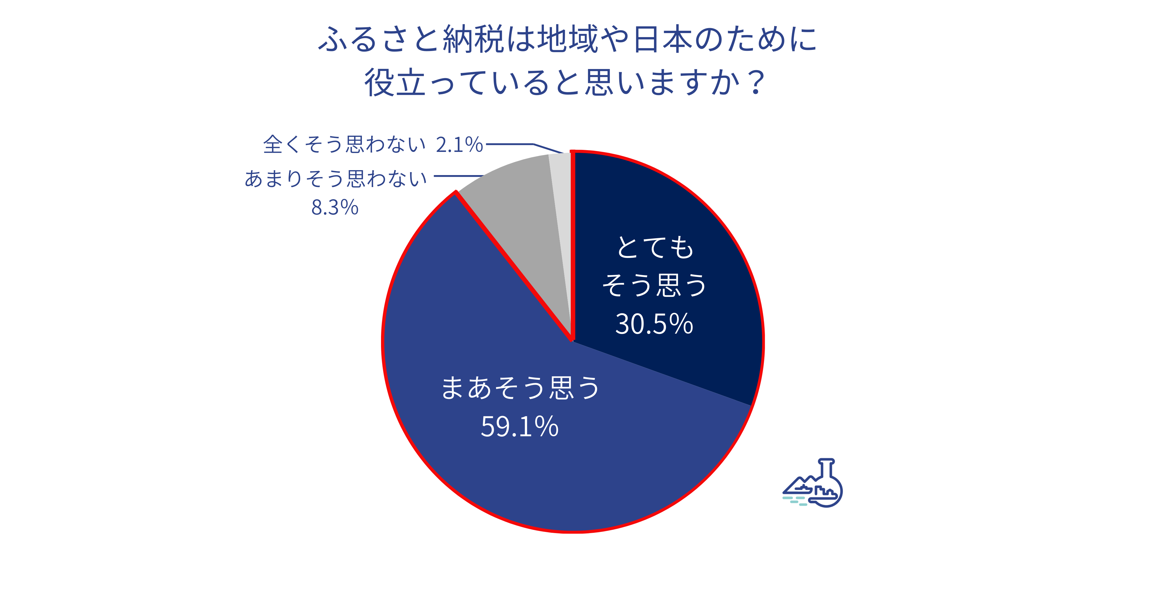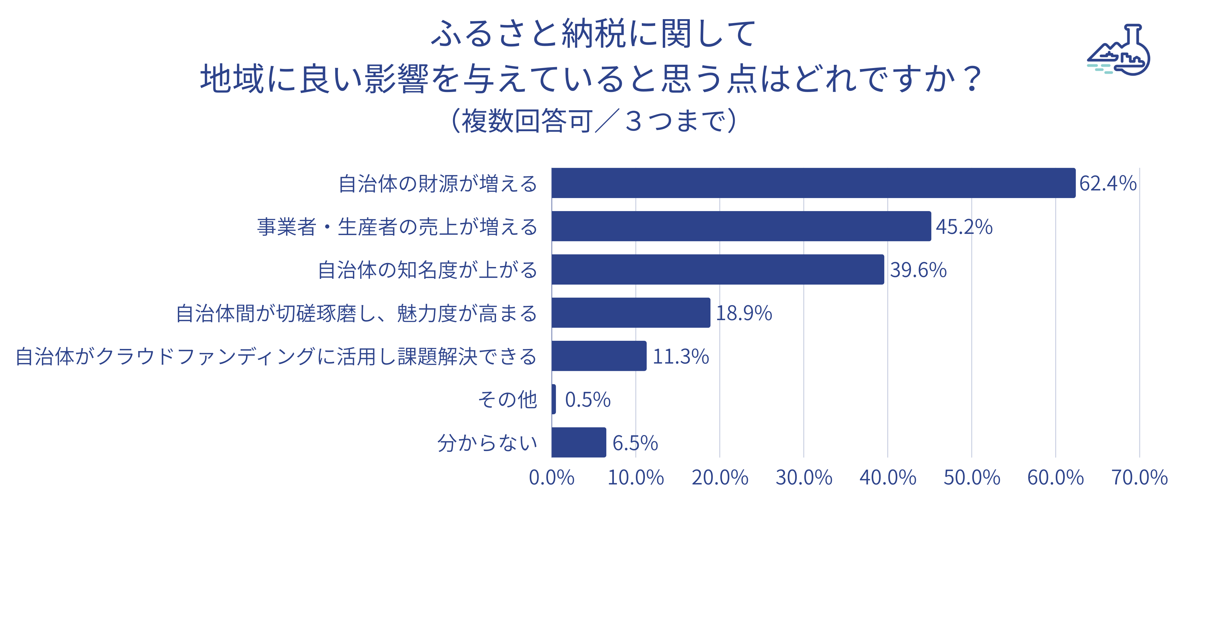 ・ ふるさと納税が地域に良い影響を与えている点は、最多が「自治体の財源が増える」(62.4%)で次点が「事業者・生産者の売り上げが増える」(45.2%)。ふるさと納税が「地域や日本の役に立っている」と思う人は89.6%(「とてもそう思う」「まあそう思う」の計)。