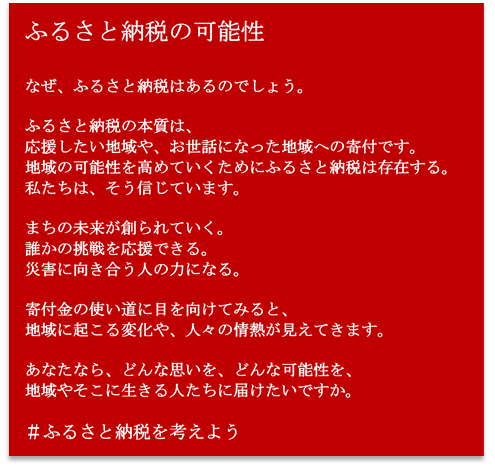 ふるさとチョイスは、今後もふるさと納税の可能性の発信を通じて、これまで以上に自治体や地域の事業者・生産者の想いや取り組みが伝わり、全国に地域のファンを広げていくことができるようなサイトづくりを目指すとともに、これからも地域と共に制度の発展に取り組んでまいります。