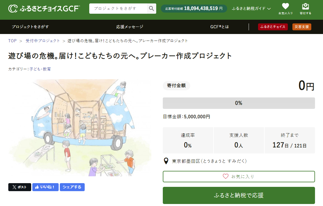 ・「遊び場の危機。届け!こどもたちの元へ。プレーカー作成プロジェクト」は、多くのこどもたちが自由に過ごせるあそび場の運営資金やあそび大学が出向いてあそび場を展開するプレーカーの購入資金などに活用します。