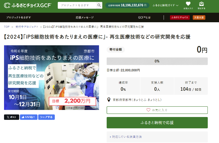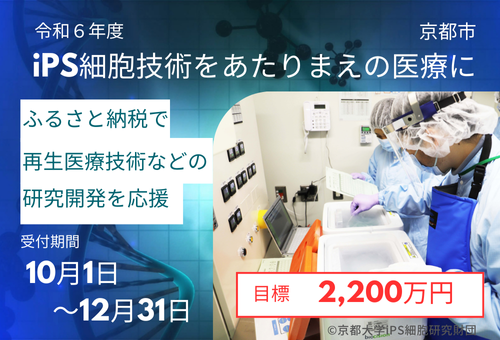 京都府京都市(市長:松井孝治、以下「京都市」)と国内最大級のふるさと納税総合サイト「ふるさとチョイス」( https://www.furusato-tax.jp/ )を企画・運営する、株式会社トラストバンク(本社:東京都品川区、代表取締役:川村憲一、以下「トラストバンク」)は、本日10月1日トラストバンクが提供する、ふるさと納税制度を通じてクラウドファンディング型で寄付を募る仕組み「ガバメントクラウドファンディング®」(以下「GCF®」)で、iPS細胞に関する技術を企業や研究者へ橋渡しする取り組みを行う(公財)京都大学iPS細胞研究財団(以下、「iPS財団」)の支援や、再生医療をはじめとしたライフサイエンス分野における研究開発を支援することを目的としたプロジェクトを開始します。募集期間は2024年10月1日~12月31日で、目標寄付金額は2,200万円です。