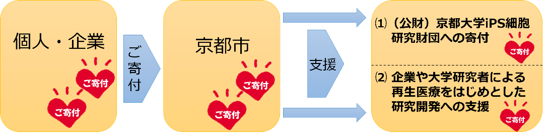 京都市では、「治らない病気を 1つでも減らしたい」という想いで、iPS財団への寄付、そしてiPS細胞技術をはじめとする再生医療等の研究開発への支援を目的に、令和2年度から本プロジェクトを立ち上げました。