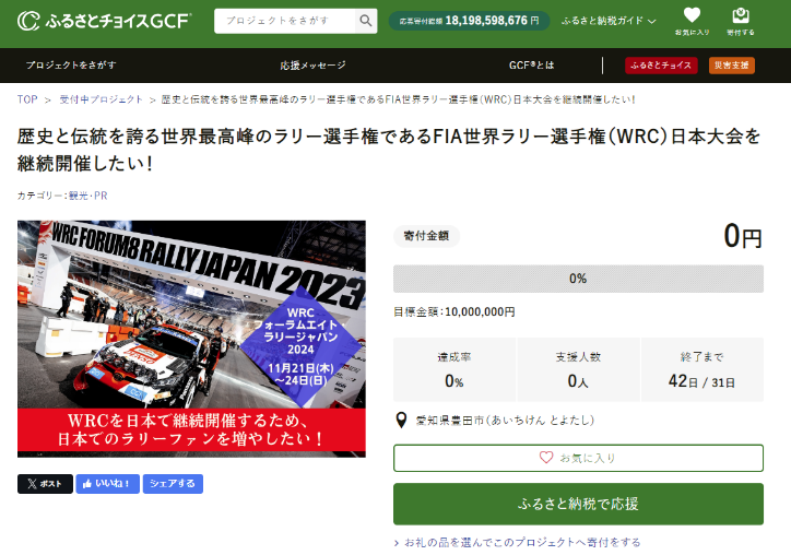 愛知県豊田市(市長:太田稔彦、以下「豊田市」)と国内最大級のふるさと納税総合サイト「ふるさとチョイス」( https://www.furusato-tax.jp/ )を企画・運営する、株式会社トラストバンク(本社:東京都品川区、代表取締役:川村憲一、以下「トラストバンク」)は、本日10月1日トラストバンクが提供する、ふるさと納税制度を通じてクラウドファンディング型で寄付を募る仕組み「ガバメントクラウドファンディング®」(以下「GCF®」)で、FIA世界ラリー選手権(以下「WRC」)日本大会の継続開催に向けたプロジェクトを開始します。募集期間は2024年10月1日~10月31日で、目標寄付金額は1,000万円です。