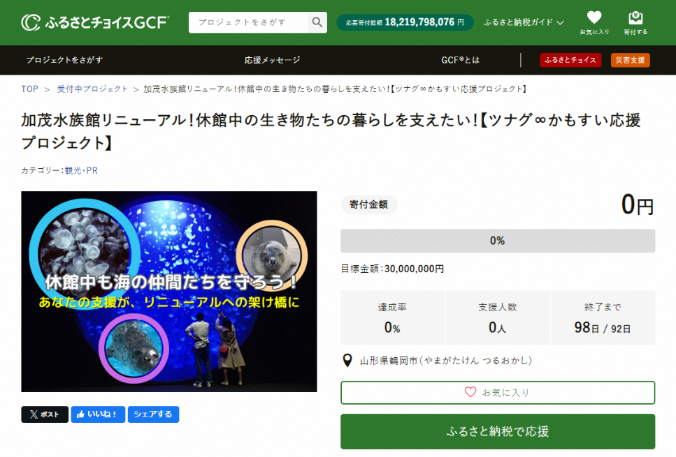 山形県鶴岡市(市長:皆川治、以下「鶴岡市」)と国内最大級のふるさと納税総合サイト「ふるさとチョイス」( https://www.furusato-tax.jp/ )を企画・運営する、株式会社トラストバンク(本社:東京都品川区、代表取締役:川村憲一、以下「トラストバンク」)は、本日10月3日トラストバンクが提供する、ふるさと納税制度を通じてクラウドファンディング型で寄付を募る仕組み「ガバメントクラウドファンディング®」(以下「GCF®」)で、鶴岡市立加茂水族館のリニューアルに伴う休館期間中の飼育環境整備を目的としたプロジェクトを開始します。募集期間は2024年10月3日~12月31日で、目標寄付金額は3,000万円です。