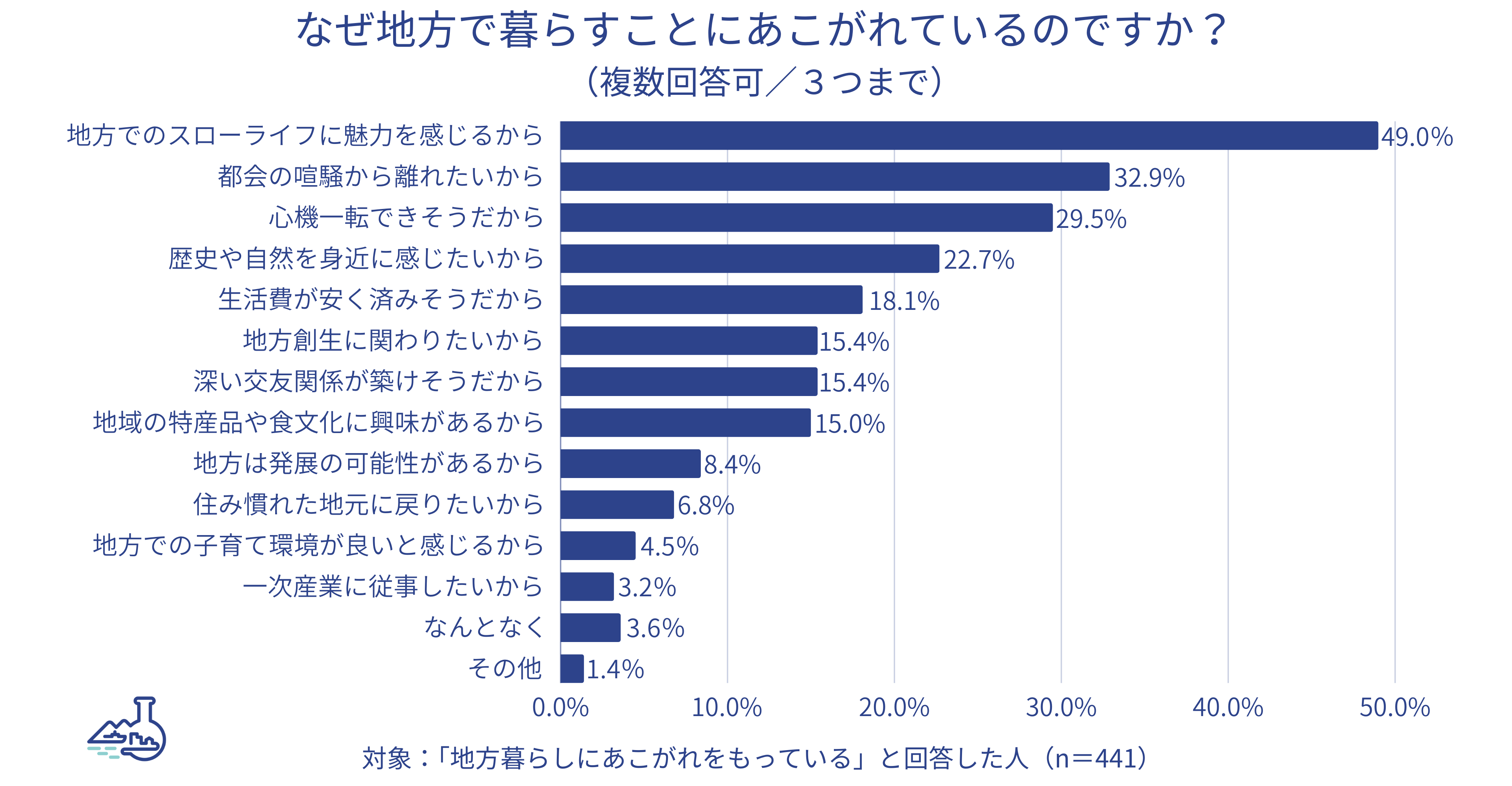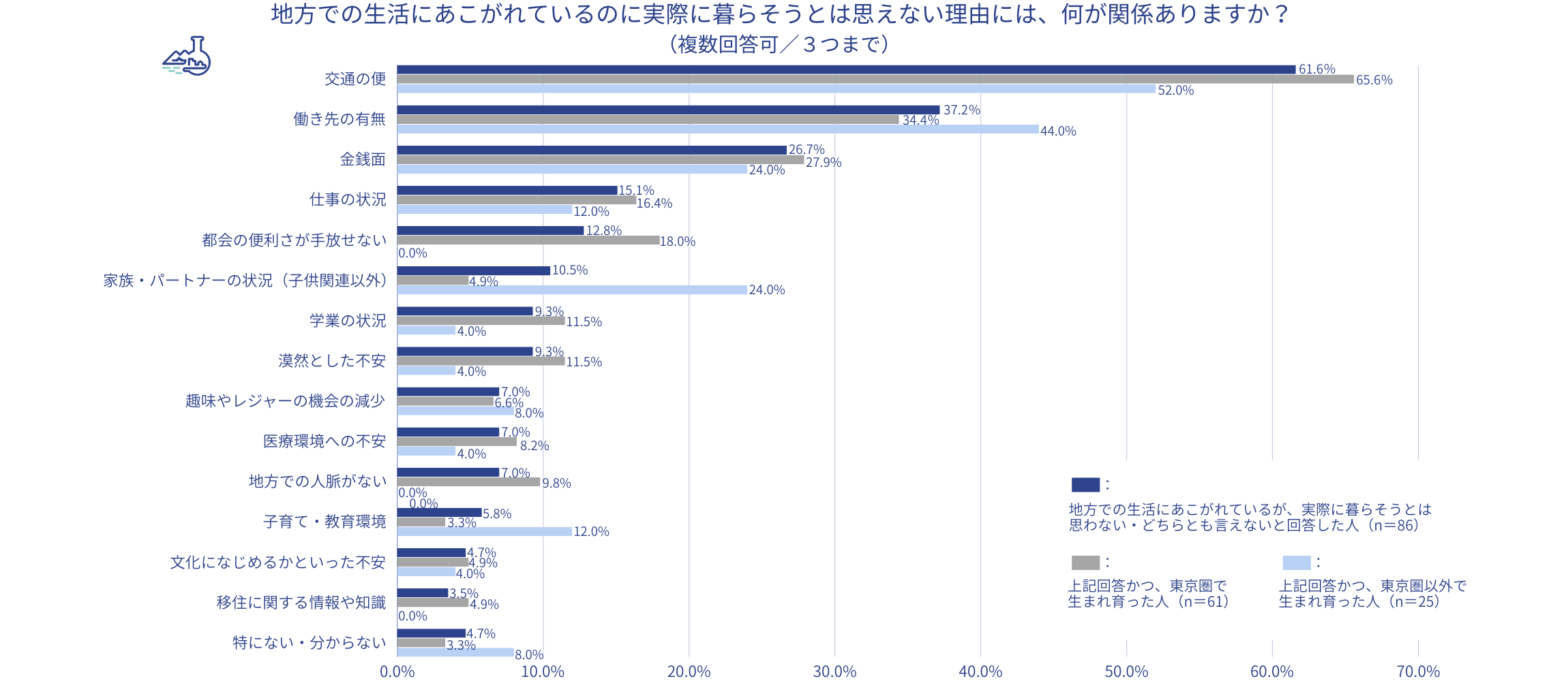◆ 地方で暮らすことに憧れる若者は45.6%(「とても憧れる」「まあ憧れる」の計)。理由は多い順に「地方でのスローライフに魅力を感じるから」(49.0%)「都会の喧騒から離れたいから」(32.9%)「心機一転できそうだから」(29.5%)。都会疲れが地方への憧れを生んでいる実態が明らかに。一方、地方に憧れる人のうち、実際に暮らそうと思えない理由は「交通の便」(61.6%)「働き先の有無」(37.2%)「金銭面」(26.7%)と現実的な回答が目立った。