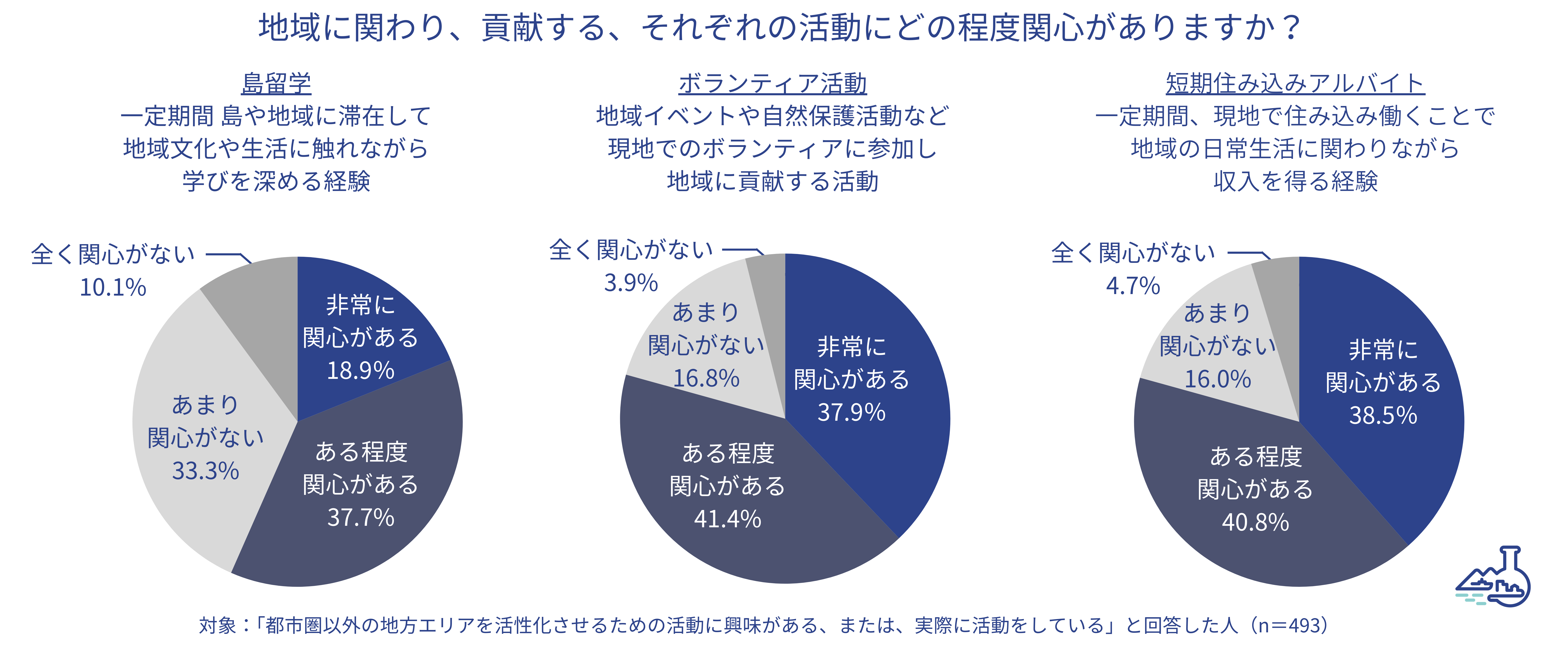 ◆ 地方を活性化させるための活動への興味を尋ねると全体では51.0%、地方で暮らすことに憧れる若者に絞ると、76.2%が、興味がある(「興味があり、実際に携わっている」「興味はあるが、携わっていない」)と回答。地方に憧れる人のうち、実際に携わっている人が24.3%いることも判明した。また、東京圏出身の若者では54.1%が「興味がある」(同上)と答えた。