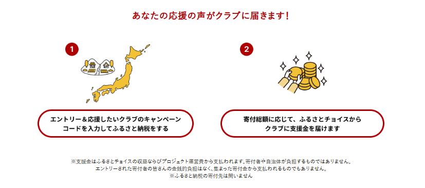 ・ 寄付者が2024年11月25日~12月31日の期間中にふるさとチョイスを通じて事前エントリーし、応援しているB.LEAGUEクラブを選んだうえでふるさと納税をすると、寄付総額に応じてふるさとチョイスが「支援金」を拠出し、クラブへ届ける取り組み