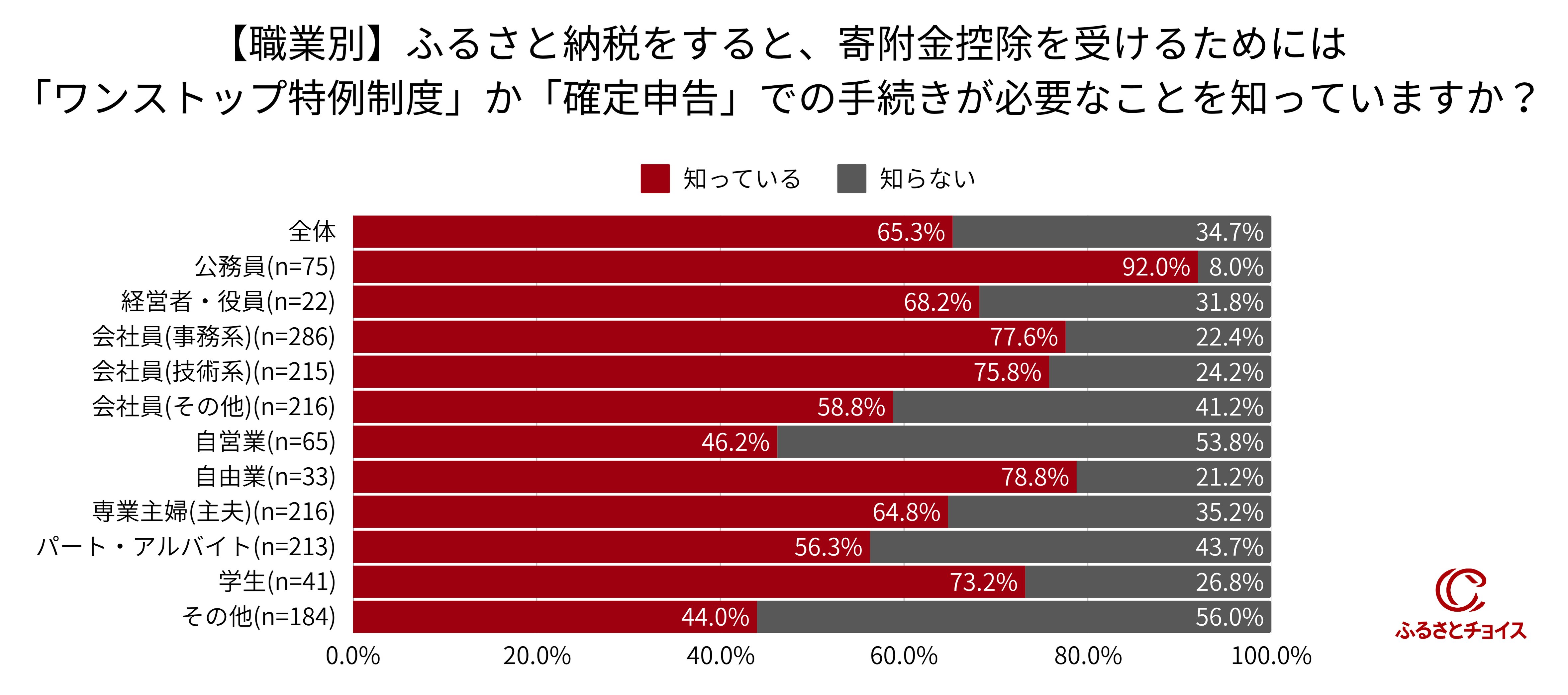 寄附金控除を受けるためには「ワンストップ特例制度」か「確定申告」での手続きが必要であることを知っているか尋ねると、全体では65.3%の人が「知っている」と回答。職業別にみると、公務員は92.0%が制度を「知っている」と回答した一方、自営業では「知らない」と回答した人が半数を超え、職業ごとで認知度の差がみられた。