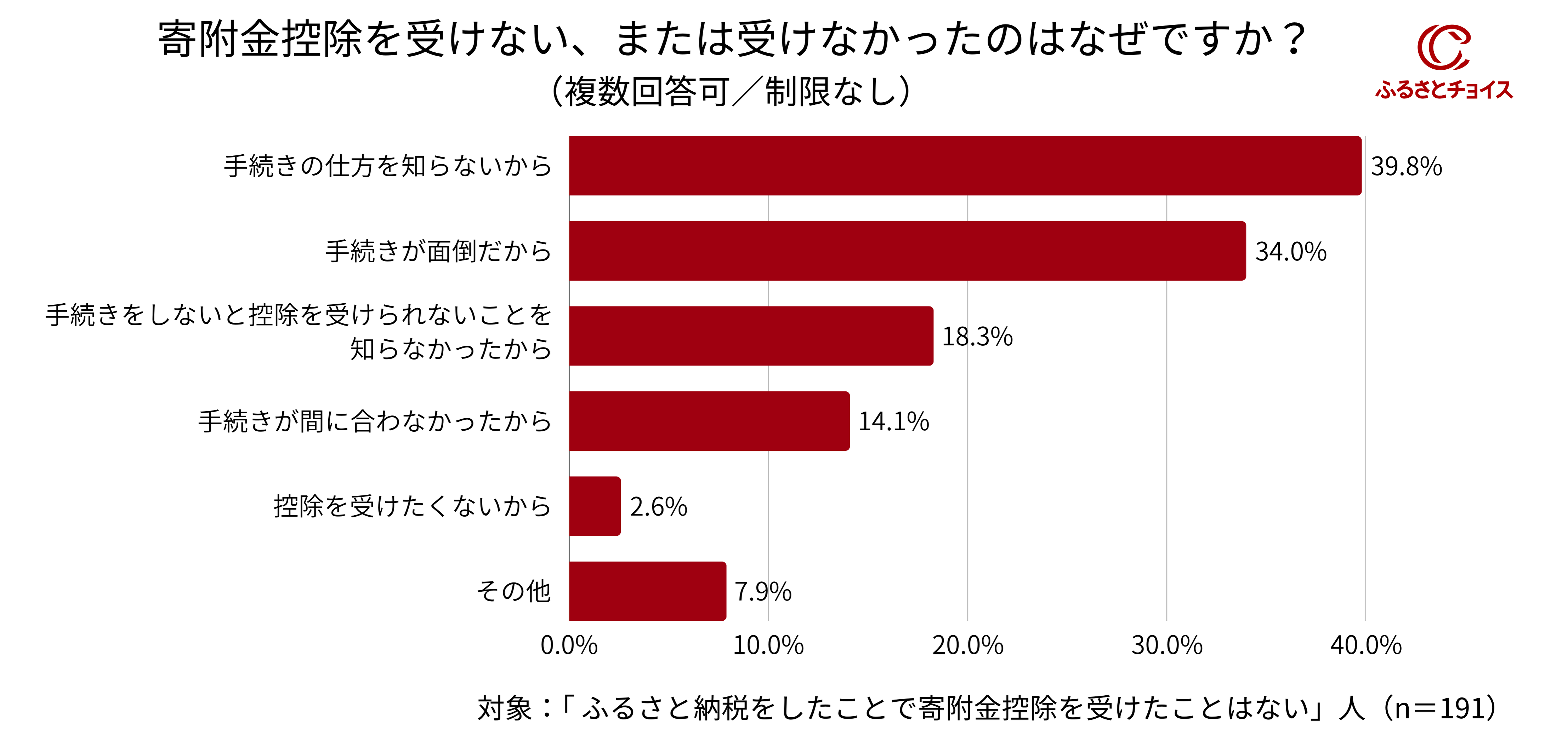 寄附金控除を受けるために手続きが必要と知っている人に、過去にふるさと納税をしたことで寄附金控除を受けたことがあるかを尋ねると、ふるさと納税をしたことがないと答えた人を除き、4人に1人(25.2%)は寄附金控除を受けたことがないことがわかった。受けなかった理由は多い順に「手続きの仕方を知らない」(39.8%)、「手続きが面倒だから」(34.0%)。