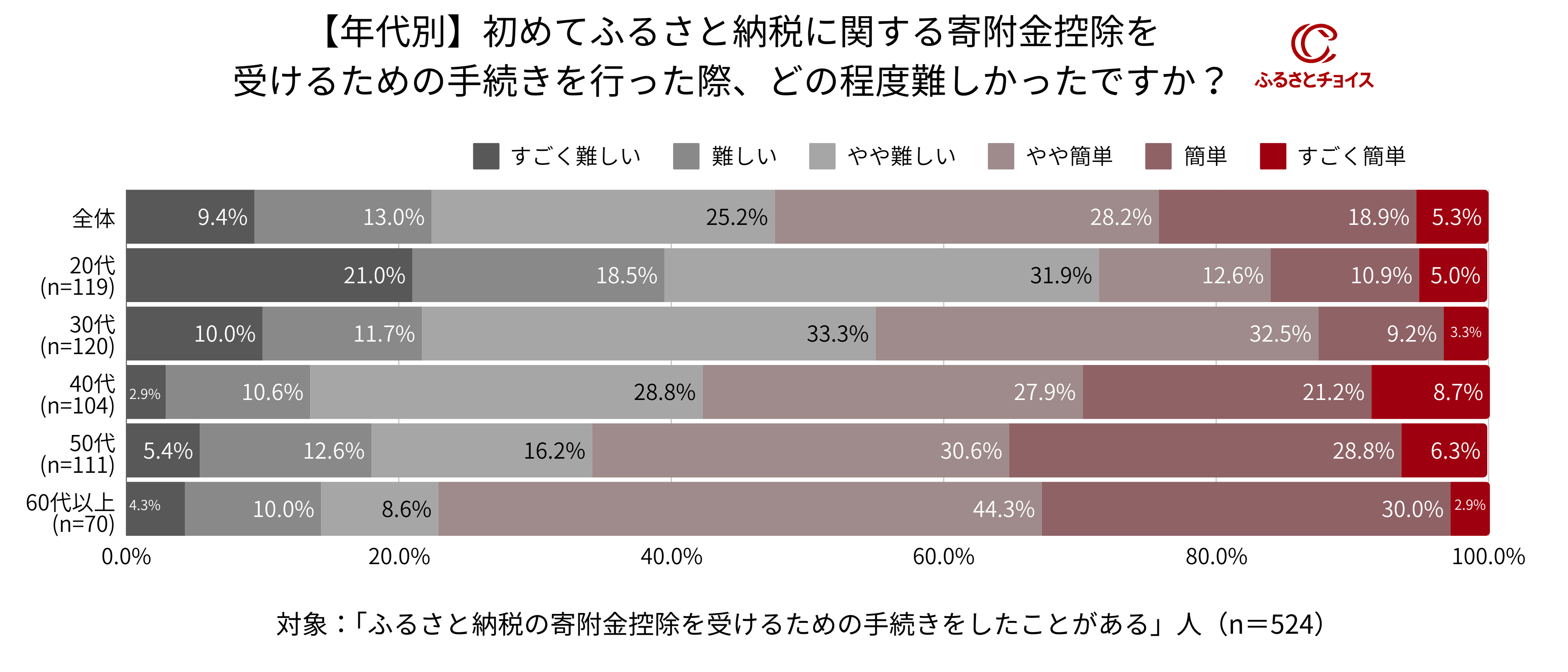 初めての手続きの難易度について、半数以上の52.4%の人は「簡単だった」と回答。一方、年代別でみると年代が下がるほど「難しかった」と回答する割合が増え、20代では71.4%となった。手続きで時間がかかる・面倒な作業でみてみると、多い順に「確定申告のやり方について調べること」(39.0%)、「寄附金受領証明書を集めること」(28.5%)だった。