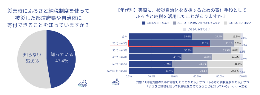 ◆ふるさと納税で被災自治体に寄付できることを知っているのは全体の47.4%。災害支援寄付経験がある人に絞ると、実際にふるさと納税で寄付したことがある人は55.6%で、「ふるさと納税で寄付したことはないが今後は活用してみたい」と答えた人は27.4%。